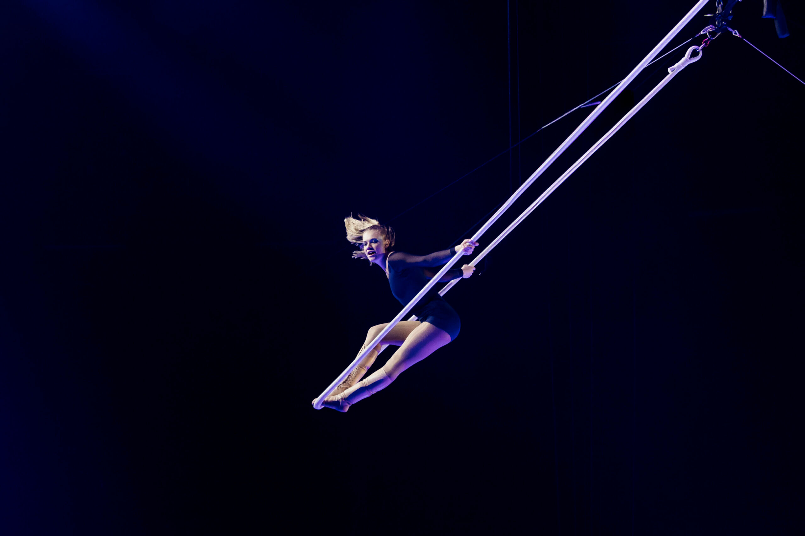 Auf der Cloud Swing präsentiert Lisa Hünnekens eine Performance, in der Grazie und Eleganz auf anspruchsvolle Akrobatik treffen. Die gebürtige Berlinerin lebt inzwischen in Montreal, wo sie im Sommer 2025 ihren Abschluss an der Staatlichen Artistenschule absolviert hat. Mit fließender Leichtigkeit und beeindruckender Körperkontrolle schwingt sie durch die Höhe und schafft Momente, die poetisch, dynamisch und atemberaubend zugleich sind.